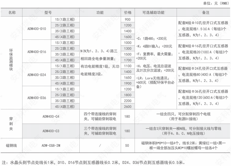 ADW400環保監測模塊主要用于計量低壓網絡的三相有功電能,同時可選擇四個回路的電流輸入,具有RS485通訊和470MHz無線通訊功能,方便用戶進行用電監測、集抄和管理。可靈活安裝于配電箱內,實現對不同區域和不同負荷的分項電能計量,統計和分析。