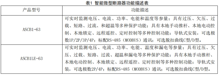 ASCB1系列智能微型斷路器(以下簡稱智能微型斷路器)應用于戶內建筑物及類似場所的工業、商業、民用建筑 及基礎設施等領域低壓終端配電網絡。智能微型斷路器配合智能網關使用,對用電線路的關鍵電氣參數,如電壓、 電流、功率、溫度、漏電、能耗等進行實時監測,具有遠程操控、異常預警、事故跳閘告警、電能計量統計、故障 定位等功能。