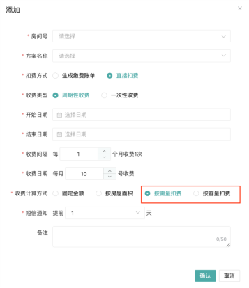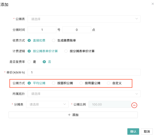 分攤方式支持固定單價、比例分攤、面積分攤、用電量分攤;