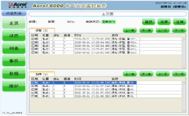 監控設備能接收多臺探測器的剩余電流、溫度信息,報警時發出聲、光報警信號,同時設備上紅色“報警”指示燈亮,顯示屏指示報警部位及報警類型,記錄報警時間,聲光報警一直保持,直至按設備的“復位”按鈕或觸摸屏的“復位”按鍵遠程對探測器實現復位。對于聲音報警信號也可以使用觸摸屏“消聲”按鍵手動消除。