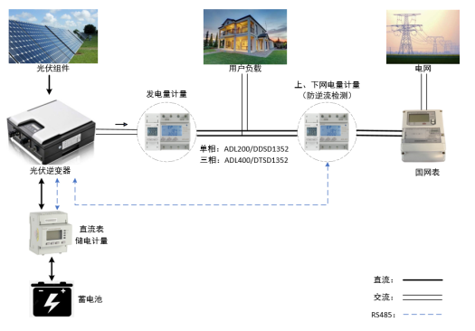 而智能電表在整個(gè)系統(tǒng)中分為三部分,一部接在逆變器與家用負(fù)載之間,主要用于計(jì)量光伏系統(tǒng)總發(fā)電量,二部則接在家用負(fù)載與國(guó)網(wǎng)表之間,主要用于計(jì)量上、下網(wǎng)電量,當(dāng)光伏發(fā)出的電用戶不能全部消耗時(shí),余下的電能輸給電網(wǎng)這時(shí)記錄為負(fù)功率或負(fù)電能;而當(dāng)光伏發(fā)電不能滿足用戶需求從電網(wǎng)購(gòu)電時(shí)則記錄為正功率或正電能,逆變器將會(huì)通過485通訊得到這些數(shù)據(jù),而后根據(jù)這些數(shù)據(jù)自主調(diào)整發(fā)電效率或者對(duì)儲(chǔ)能蓄電池送電以達(dá)到防逆流的功能。三部電表采用直流表,安裝在逆變器與蓄電池之間,主要用于計(jì)量?jī)?chǔ)能模塊充放電數(shù)據(jù)。綜上所述,智能電表對(duì)于整個(gè)分布式光伏系統(tǒng)的儲(chǔ)能判斷、用電分析以及防逆流等功能具有重要意義。