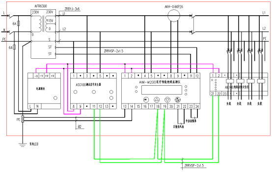 絕緣監(jiān)測裝置的任務(wù)是監(jiān)測相線與大地之間的絕緣電阻,當(dāng)阻值低于設(shè)定值時發(fā)出報警提示。絕緣監(jiān)測裝置裝于隔離變壓器二次側(cè)出線與大地之間,在系統(tǒng)中施加測量電流,當(dāng)系統(tǒng)絕緣電阻下降時,發(fā)出報警信號。AIM-M10型絕緣監(jiān)測儀自帶一路24V直流電源輸出,可為AID150型集中報警顯示儀供電。