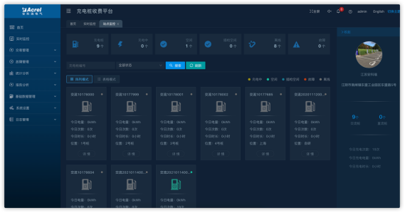 可以按站點名稱進行篩選,顯示站點詳情、充電槍列表、統計訂單信息、故障記錄,點擊某個充電槍編號后在進入充電槍監控頁面