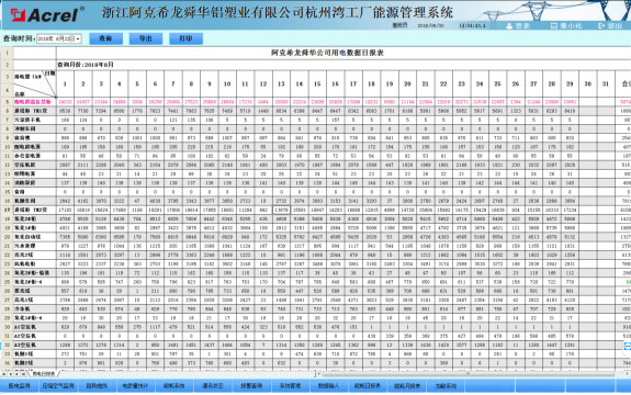 為了實現對阿克希龍各用能回路用能量的監管,系統設計了能源管理報表,系統通過對有功電度、用水、用氣等能源的采集,按照回路名稱的不同。按照計量體系搭建原則,自動生成日報表、月報表和年報表,將各進線回路與出線回路電能消耗量在同一張報表中體現出來,并計算出線回路用電量之和,出線回路與進線回路誤差、誤差百分比(誤差百分比是否超標)等,幫助用戶及時發現這種非正常用電問題。