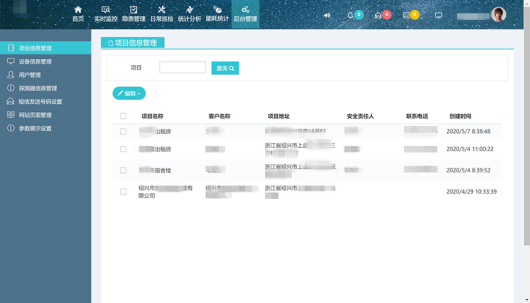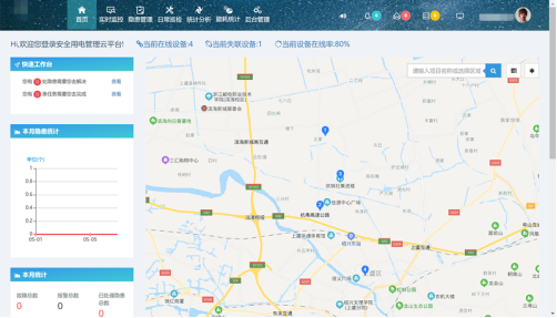 通過平臺首頁可以快速瀏覽隱患巡查界面或隱患處理界面、本月隱患、故障統計以及項目信息地圖導航,智能調度技術人員可以通過曲線、地圖等各種方式查看隱患數量、隱患位置、隱患發生頻率以及任務的接收、下發情況,并可以通過項目列表、地圖快速查定位需要查詢的項目情況。