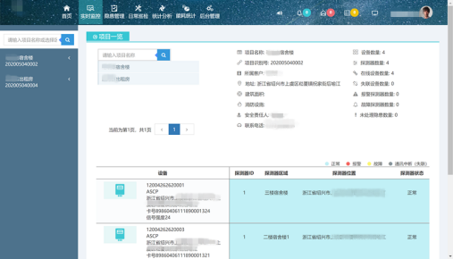 通過實時監控界面,除了可以實時顯示項目所屬客戶、地址、建筑面積、消防設施、安全責任人、聯系電話、設備數量、探測器數量等信息,還以更醒目的方式顯示了未處理報警和未處理故障信息,下屬設備和探測器,并可以查看各設備以及探測器基本信息、開關操作、數據監控、實時數據、參數設置、歷史信息和報警信息等。