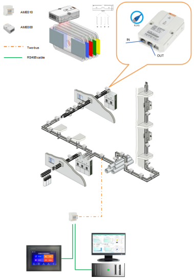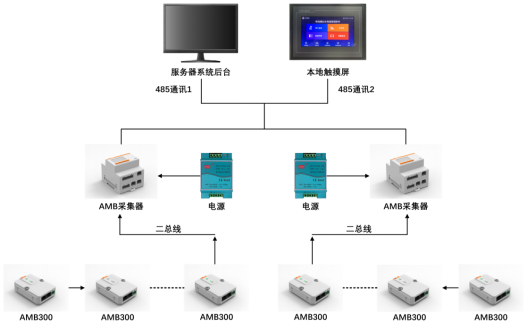 此母線槽紅外測溫解決方案由人機HMI觸摸屏,紅外測溫模塊,紅外采集器,電源模塊組成。該系統通過RS485線與本地觸摸屏和后臺監控進行通信(如下圖),系統設計遵循際標準Modbus-RTU傳輸規約,安全性、可靠性和開放性都得到了很大地提高。RS-485作為一種串行通信的接口具有傳輸距離長、速度較高、電平兼容性好、使用靈活方便、成本低廉和可靠度高等特點,與無線通信方式相比,具有價格低、抗共模干擾能力強等優點。
