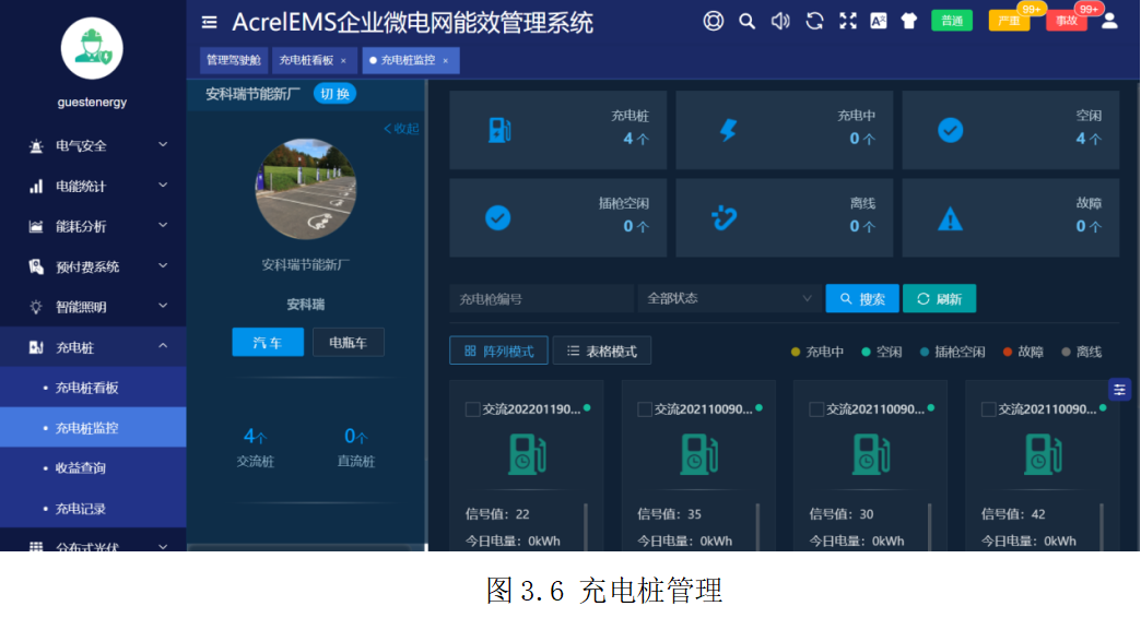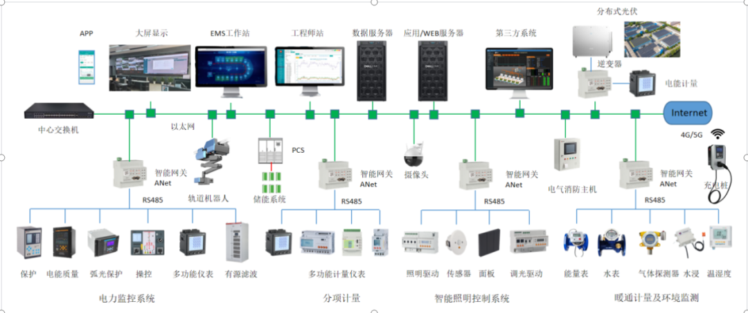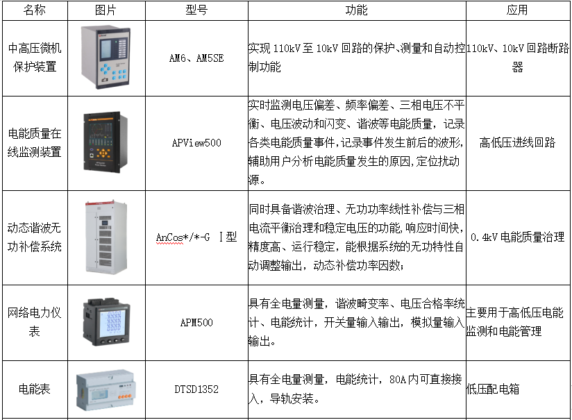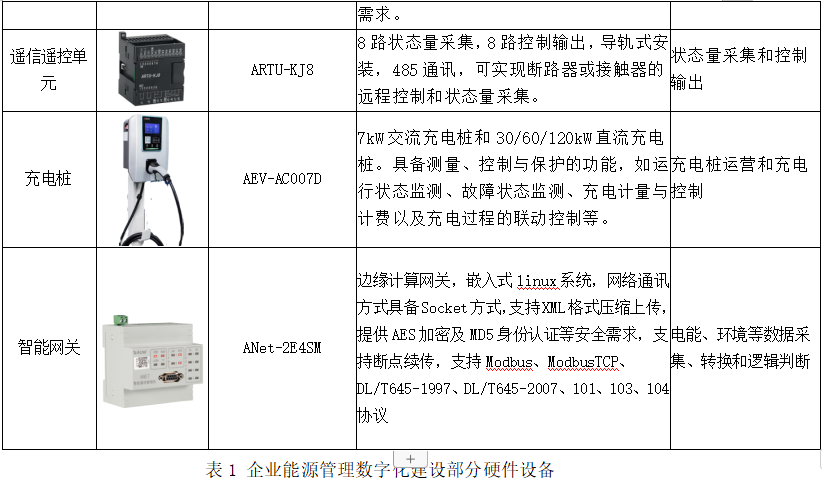 3.5 儲能管理 監(jiān)測儲能系統(tǒng)、電池管理系統(tǒng)(BMS)和儲能變流器(PCS)運(yùn)行,包括運(yùn)行模式、功率控制模式,功率、電壓、電流、頻率等預(yù)定值信息、儲能電池充放電電壓、電流、SOC、溫度,根據(jù)企業(yè)峰谷特點(diǎn)和電價(jià)波動(dòng)以及上級平臺指令設(shè)置儲能系統(tǒng)的充放電策略,控制儲能系統(tǒng)充放電,實(shí)現(xiàn)削峰填谷,降低企業(yè)用電成本。 3.6 充電樁運(yùn)營管理 監(jiān)測企業(yè)充電樁的運(yùn)行狀態(tài),提供充電樁收費(fèi)管理和狀態(tài)監(jiān)測功能,并根據(jù)企業(yè)負(fù)荷曲線和變壓器負(fù)荷率調(diào)節(jié)充電樁的充電功率,引導(dǎo)有序充電,使企業(yè)能源系統(tǒng)穩(wěn)定安全運(yùn)行。 4 企業(yè)能源管理系統(tǒng)硬件設(shè)備 安科瑞針對企業(yè)能源管理數(shù)字化系統(tǒng)除了軟件外,還具備現(xiàn)場傳感器、智能網(wǎng)關(guān)等設(shè)備,組成了完整的“云-邊-端”數(shù)字化體系,具體包括高低壓配電綜合保護(hù)和監(jiān)測產(chǎn)品、電能質(zhì)量在線監(jiān)測裝置、電能質(zhì)量治理、照明控制、新能源充電樁、電氣消防類解決方案等,可以為企業(yè)能源管理系統(tǒng)建設(shè)提供一站式服務(wù)能力,部分設(shè)備見表1。 5 結(jié)束語 面向未來,AcrelEMS企業(yè)能源管理系統(tǒng)將結(jié)合行業(yè)特點(diǎn)、服務(wù)“雙碳”目標(biāo),積極利用安科瑞“云-邊-端”的產(chǎn)品體系和能源管理數(shù)字化技術(shù)積累幫助企業(yè)改造傳統(tǒng)電網(wǎng),加快推動(dòng)企業(yè)用能向更加智慧、更加安全、更加友好的能源數(shù)字化升級,為促進(jìn)生態(tài)文明建設(shè)作出持續(xù)貢獻(xiàn)。